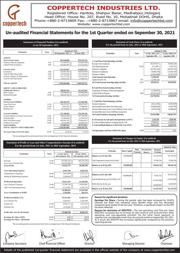 Q1 (Un-audited Financial Statements) of Coppertech Industries Limited