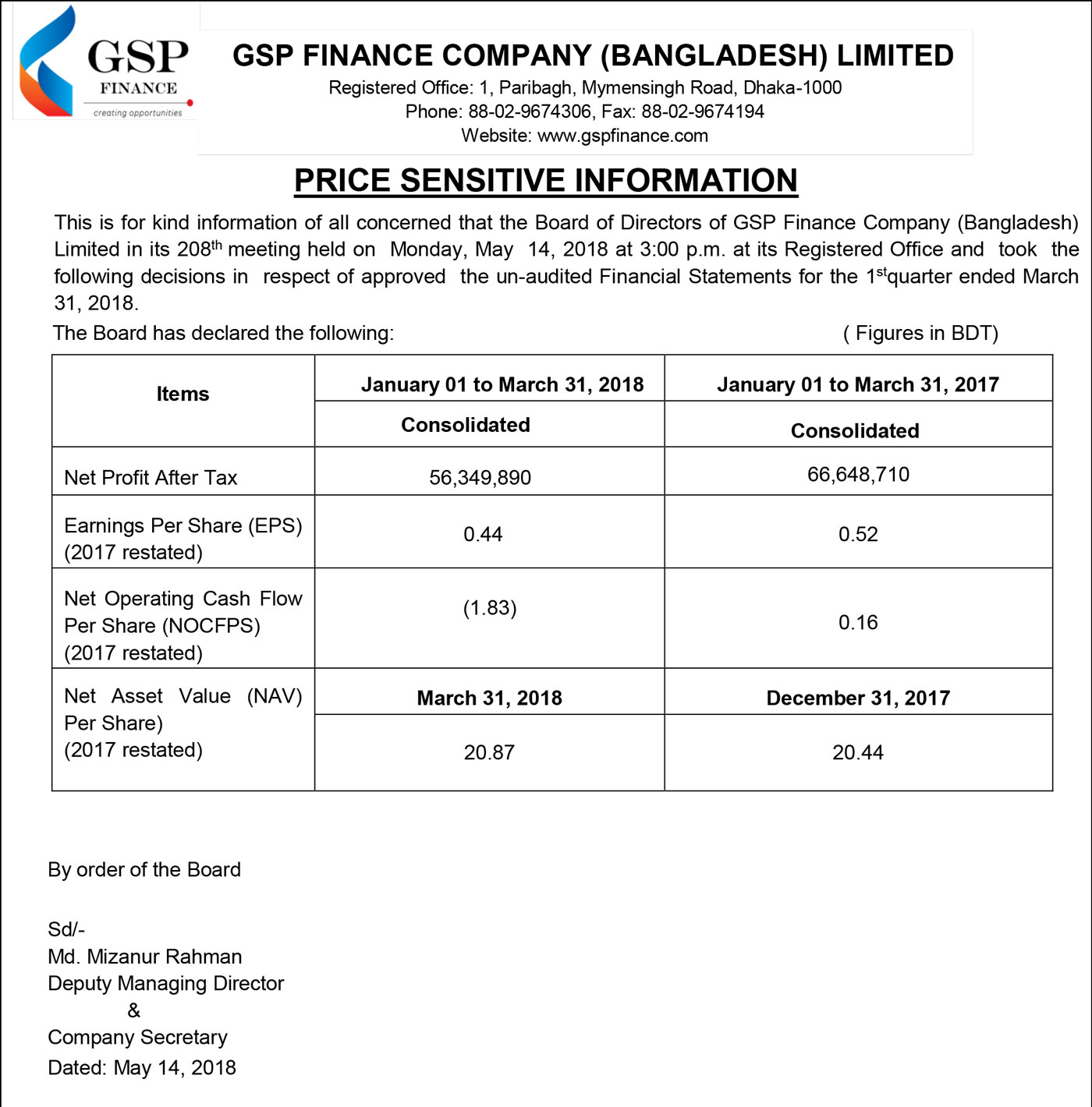 GSP Finance Company (Bangladesh) Limited Price Sensitive Information