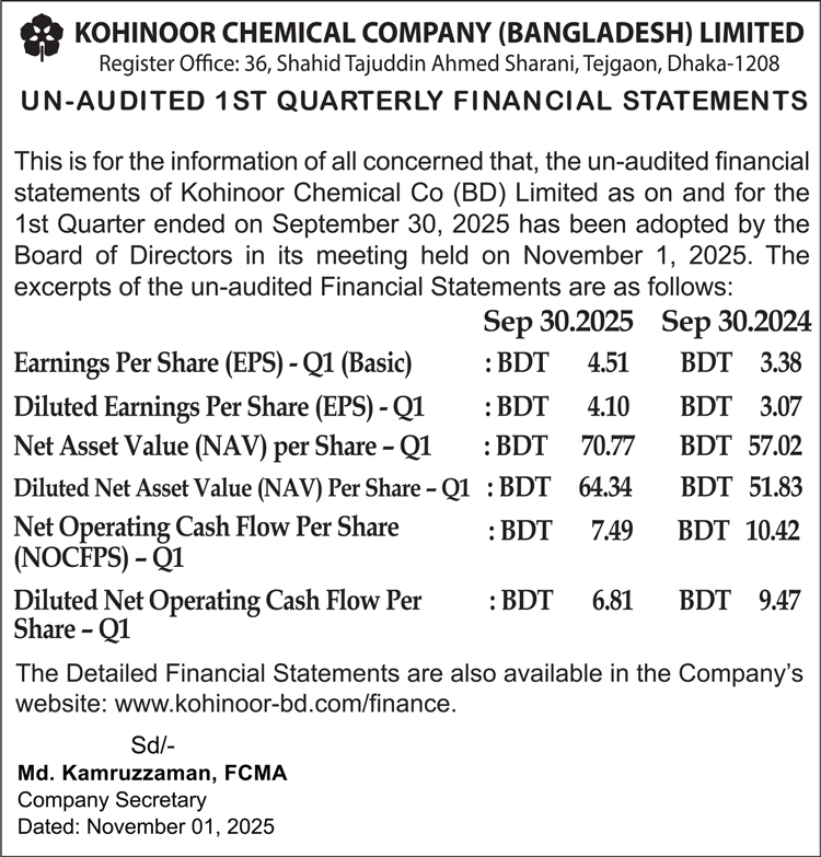 Q1 Un-audited Financial Statements of Kohinoor Chemical Company (Bangladesh) Limited