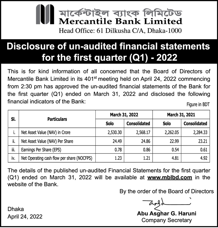 Q1 Un-audited Financial Statements of Mercantile Bank Limited.