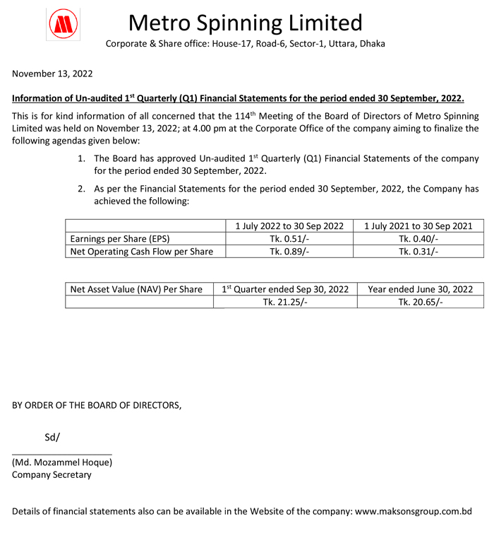 Q1 Un-audited Financial Statements of Metro Spinning Limited