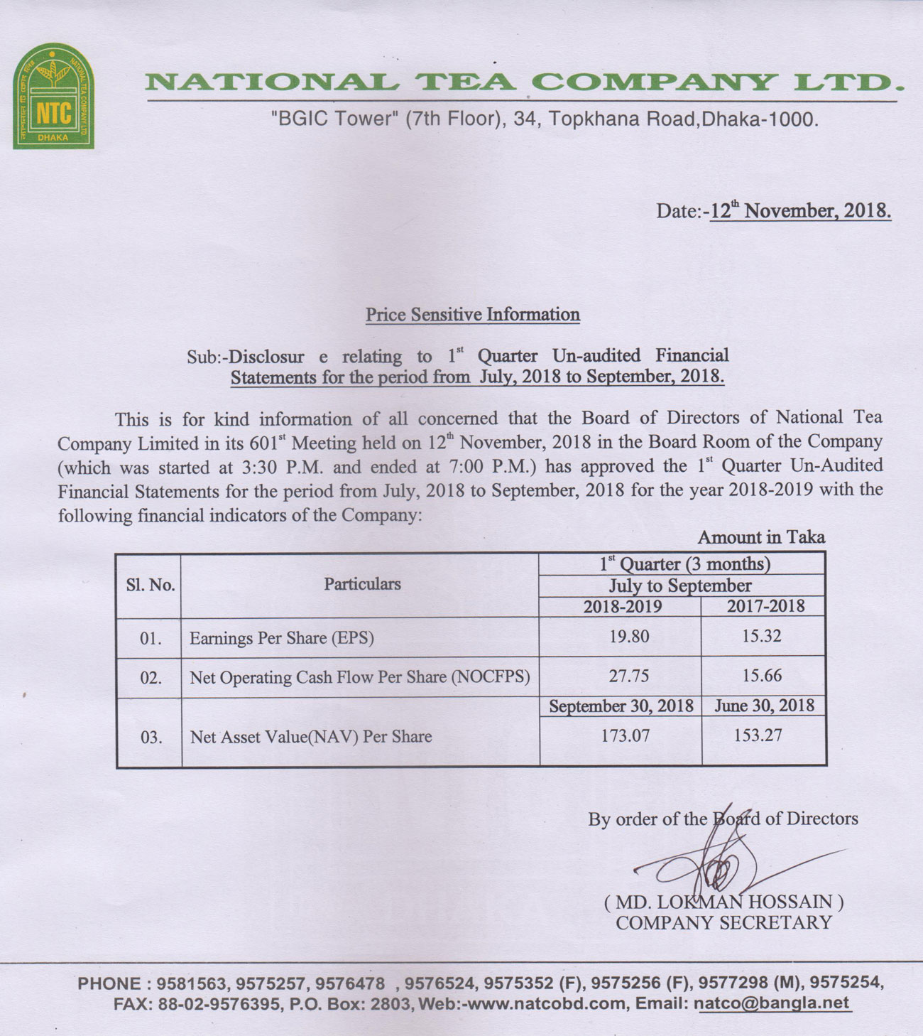 Q1 Un-audited Financial Statements of National Tea Company Ltd