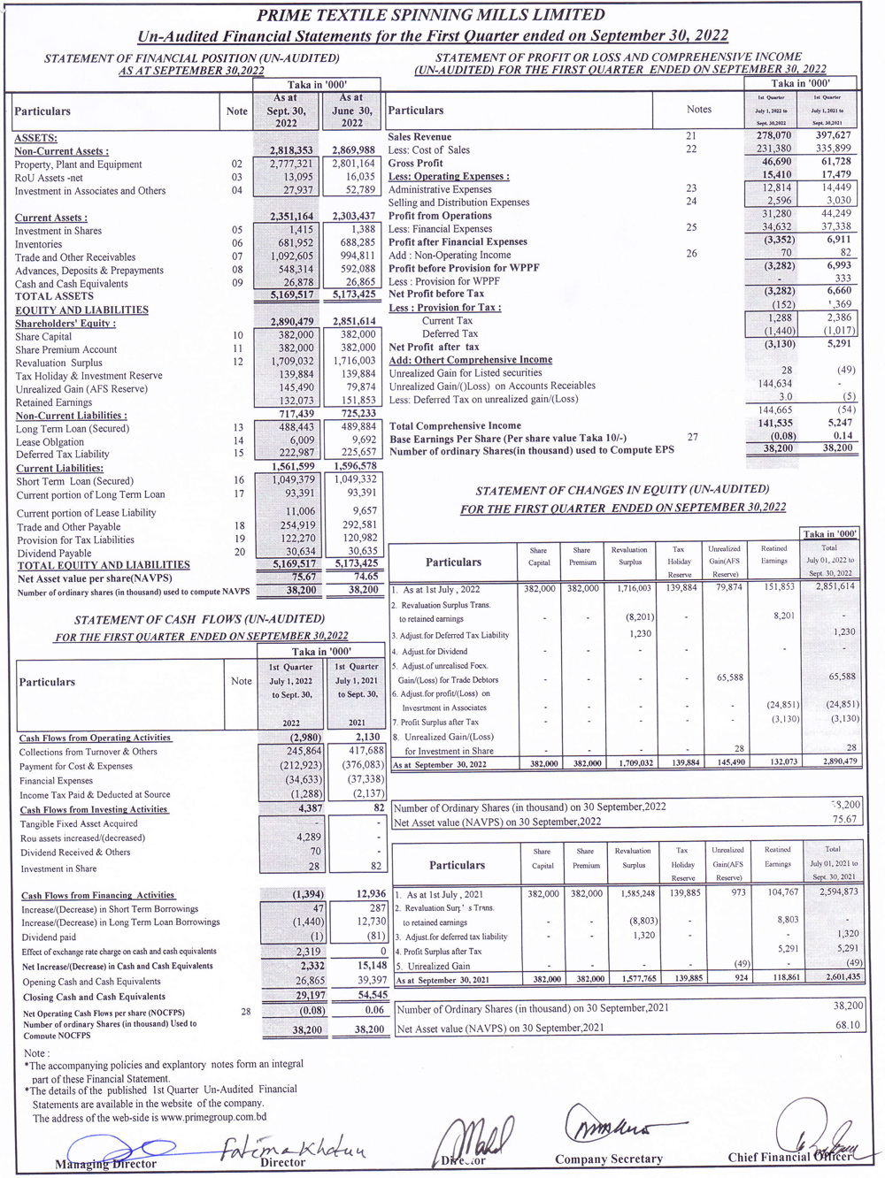 Un-audited Q1 Financial Statements of Prime Textile Spinning Mills Limited