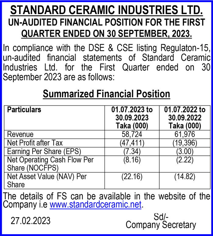 Price Sensitive Information of Standard Ceramic Industries Ltd