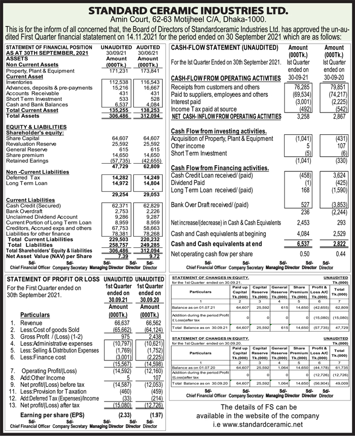 Q1 Un-audited Financial Statements of Standard Ceramic Industries Ltd