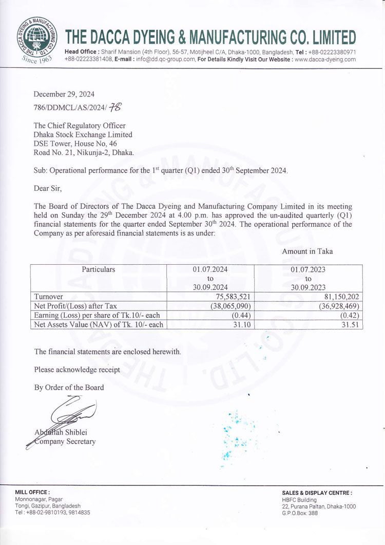 Q1 Un-audited Financial Statements of The Dacca Dyeing & Manufacturing Co.Ltd