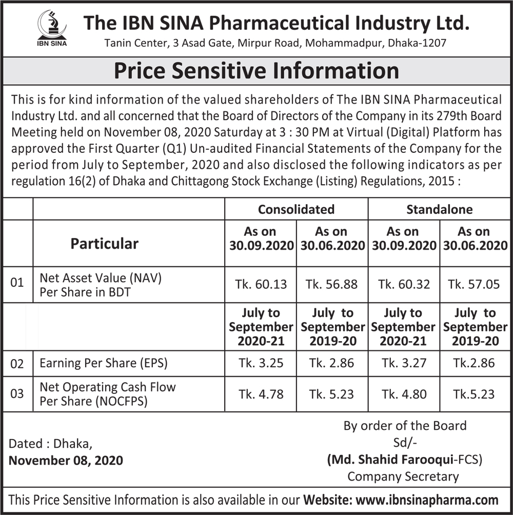 Price Sensitive Information (Q3) of IBN SINA Pharmaceutical Industry PLC.