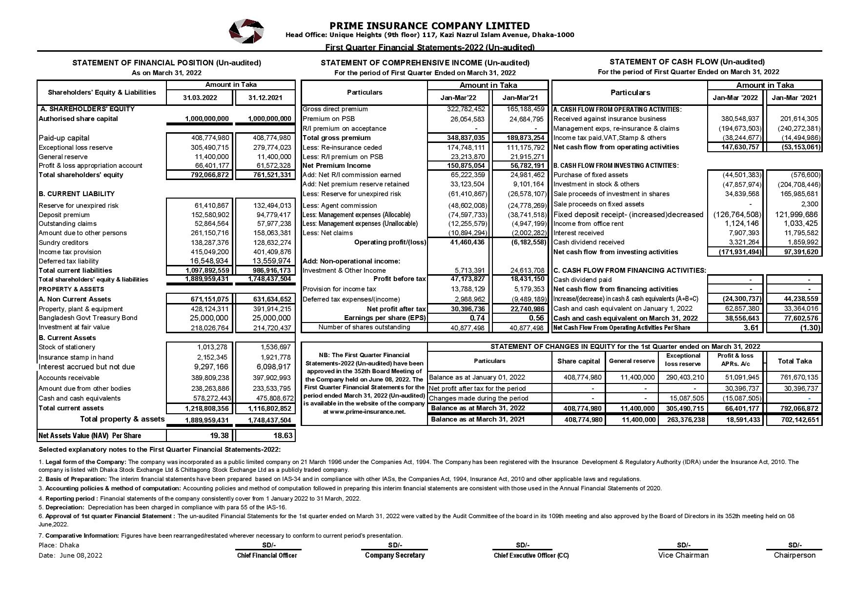 Q1 Un-initiated Financial Statements of Prime Insurance Company Limited.