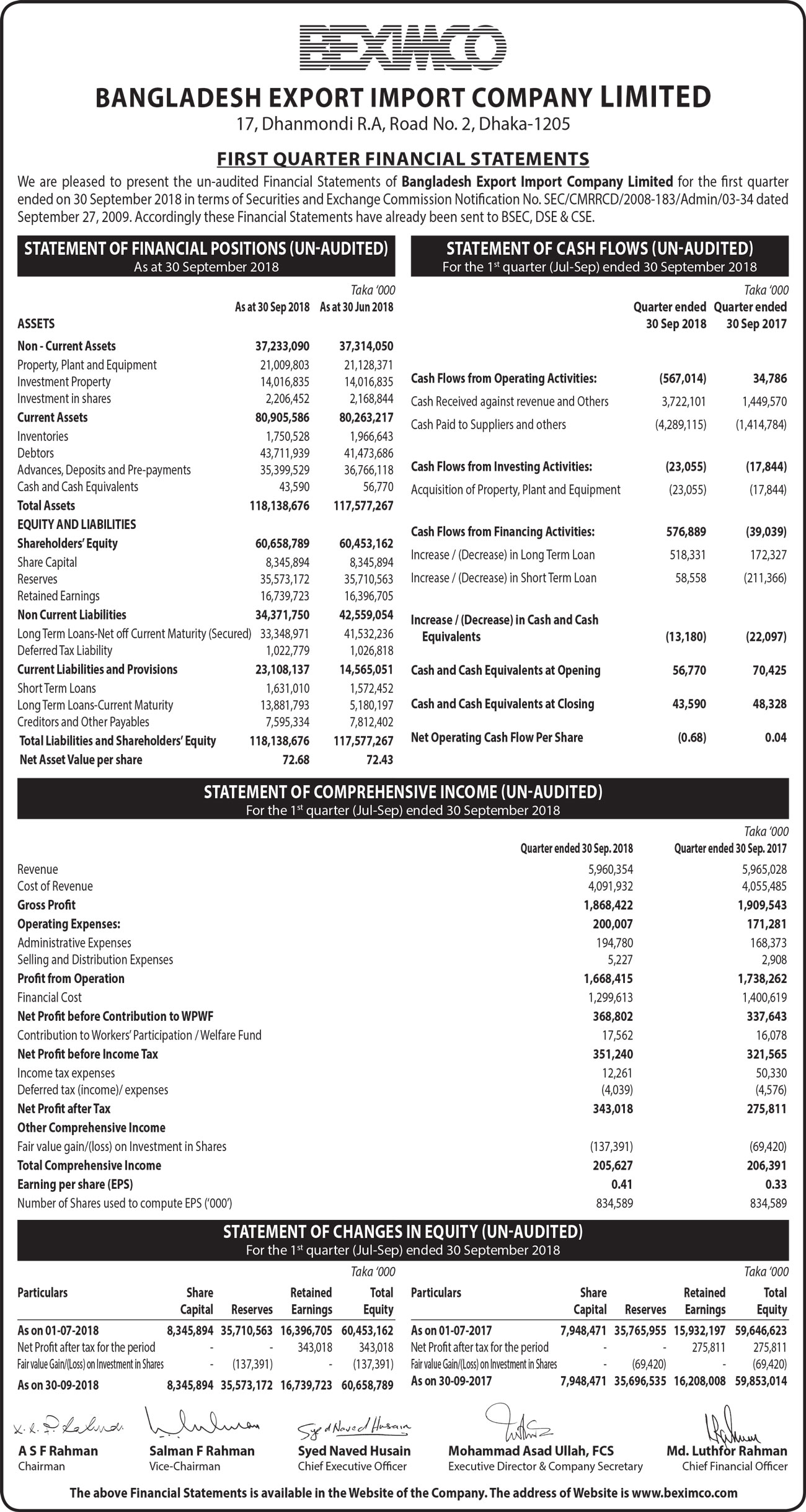 Q1 Financial Statements of Bangladesh Export Import Company Limited (BEXIMCO)