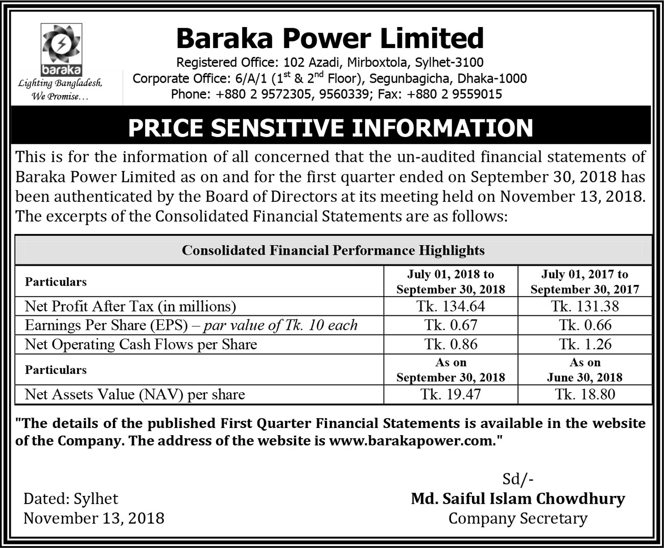 Q1 Unaudited Financial Statements of Baraka Power Limited