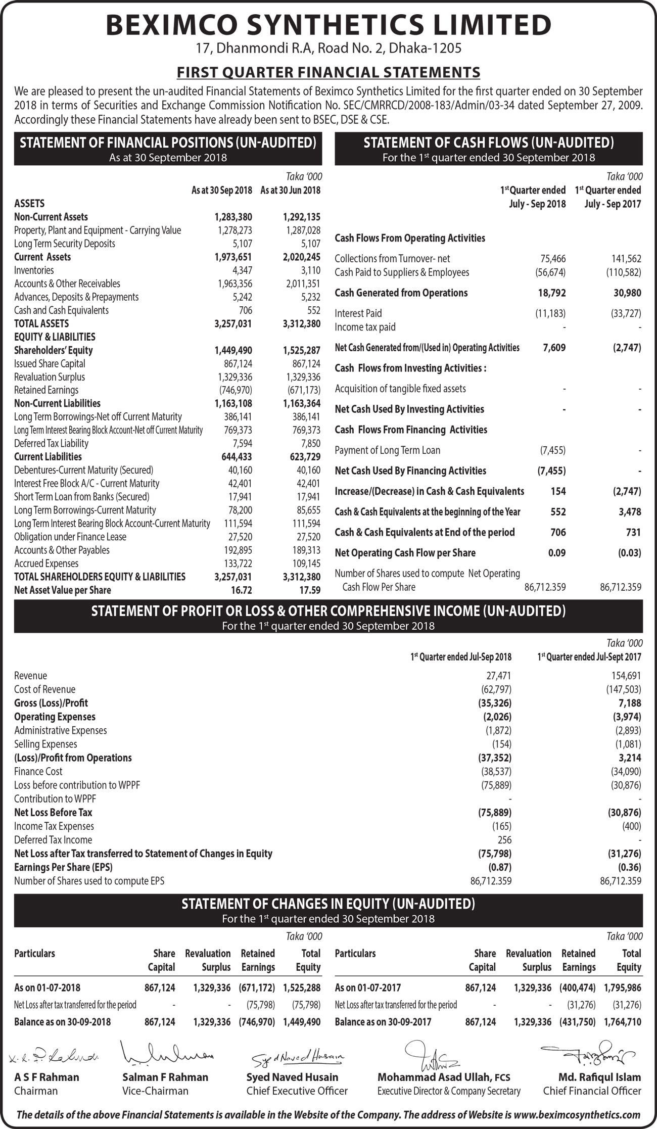 Q1 Financial Statements of Beximco Synthetics Ltd