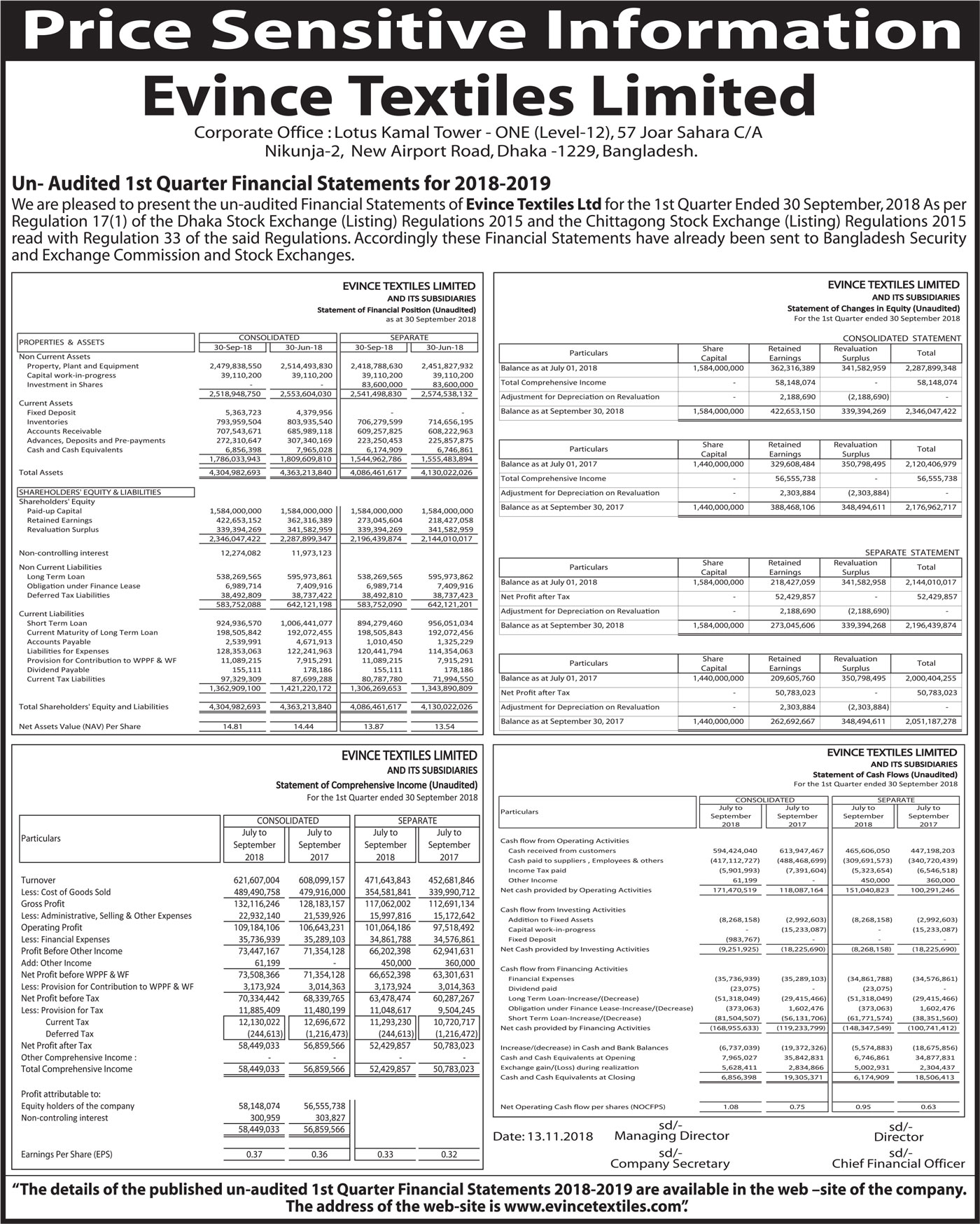 Q1 Unaudited Financial Statements of Evince Textiles Ltd
