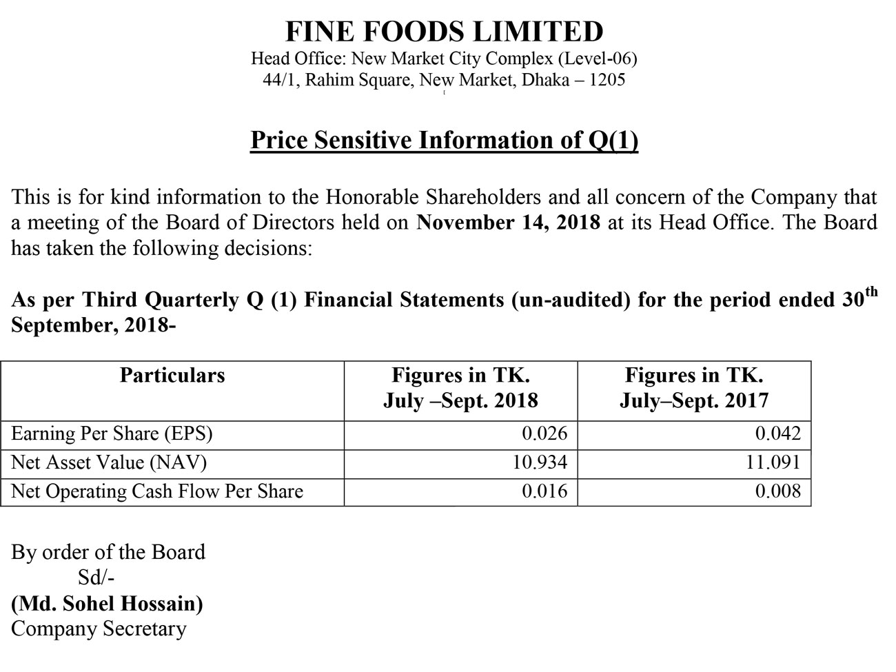 Price Sensitive Information (Q2) of Fine Foods Limited