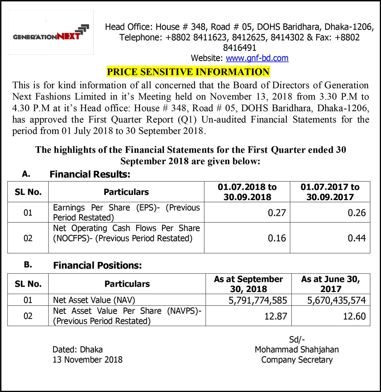 Price Sensitive Information of Generation Next Fashions Limited