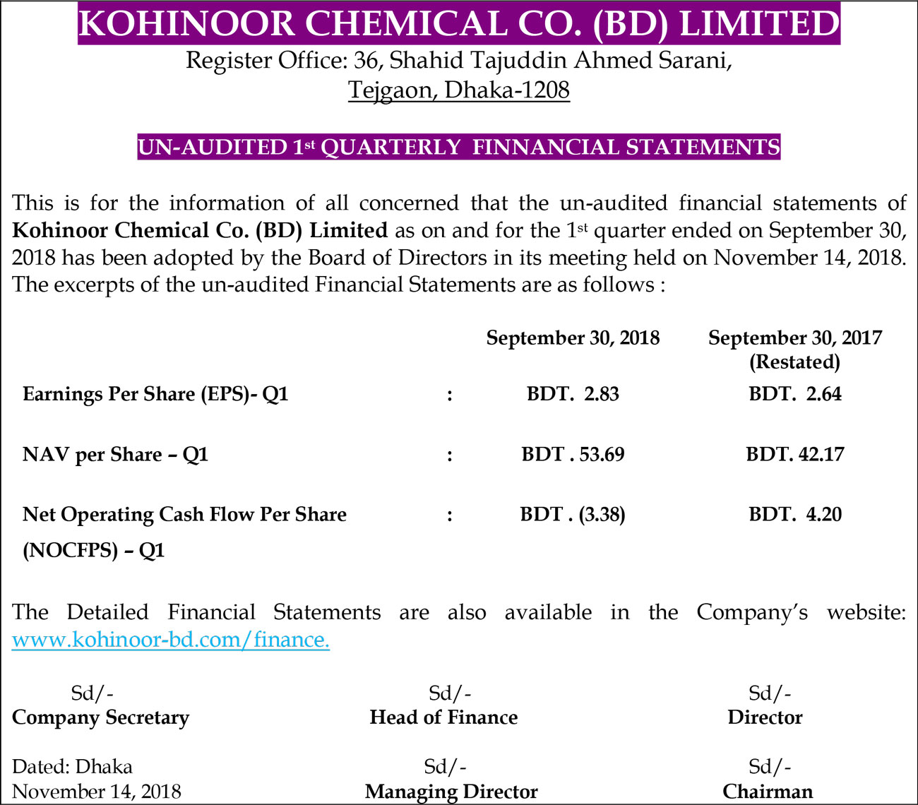 Price Sensitive Information (Q1) of Kohinoor Chemical Company (Bangladesh) Ltd.