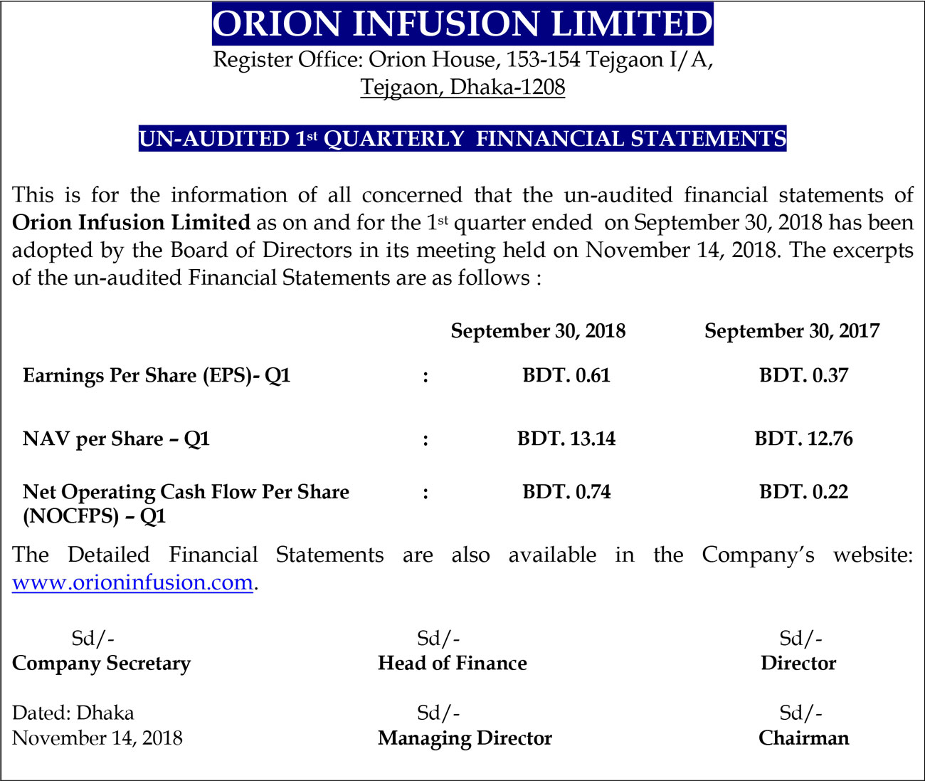Un-audited Half Yearly (Q2) Financial Statements of Orion Infusion Ltd