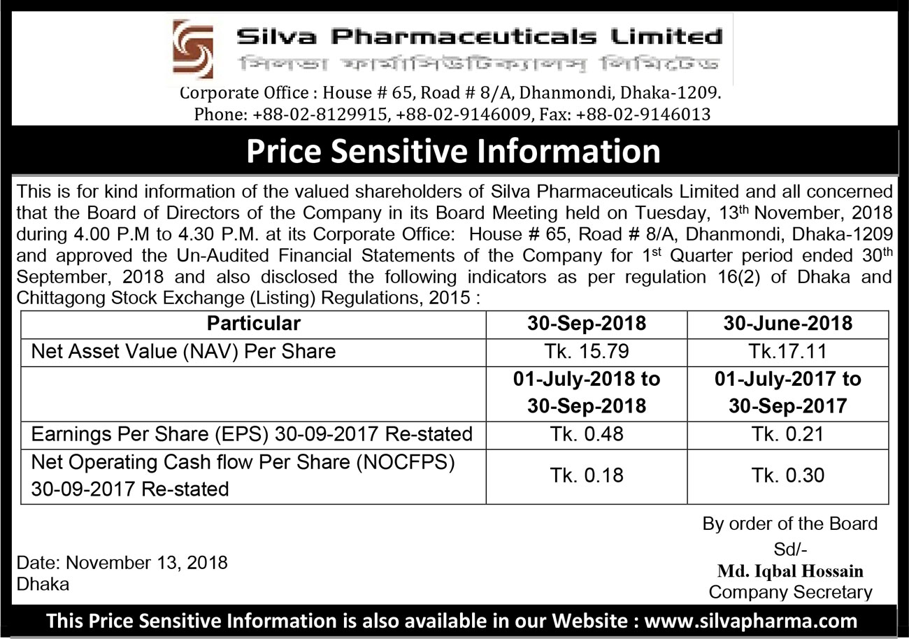 Price Sensitive Information of Silva Pharmaceuticals Limited