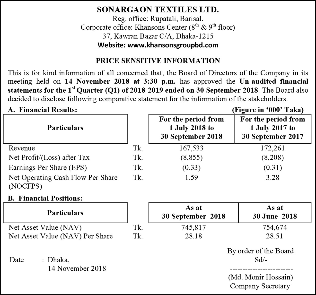 Price Sensitive Information of Sonargaon Textiles Ltd