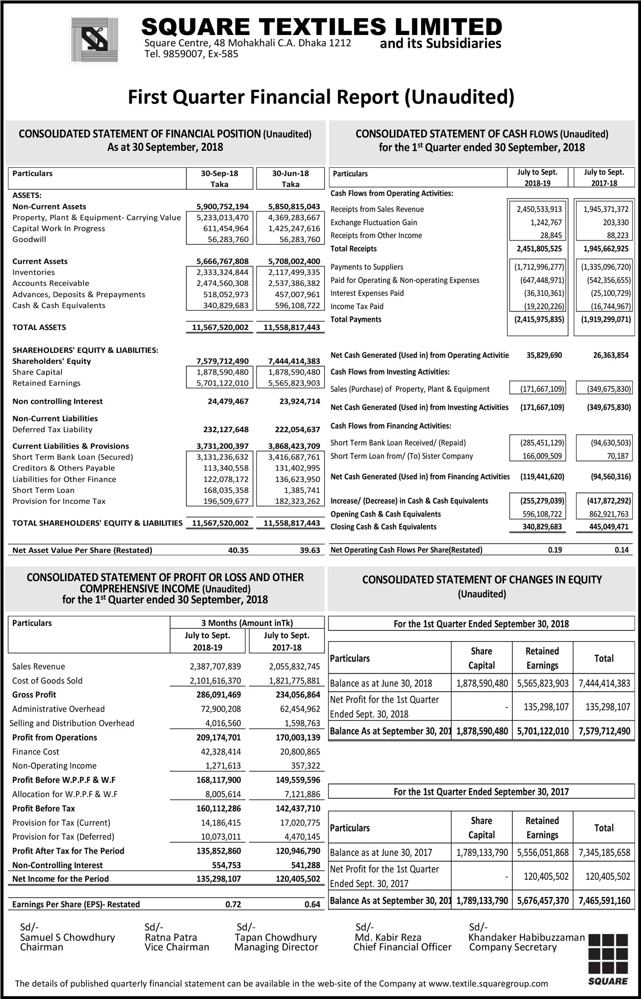 Q1 Un-audited Financial Statements of Square Textile PLC