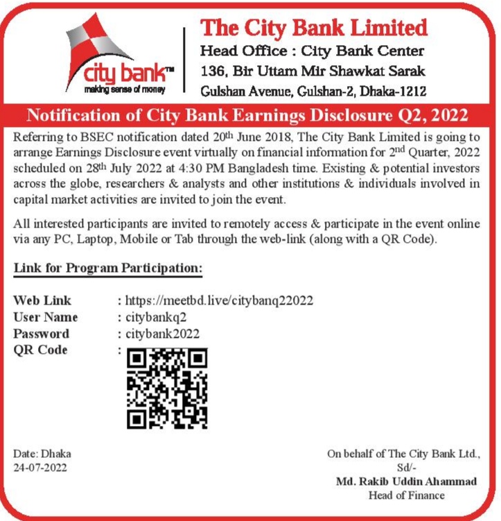 Q2 Earning Disclosure of The City Bank
