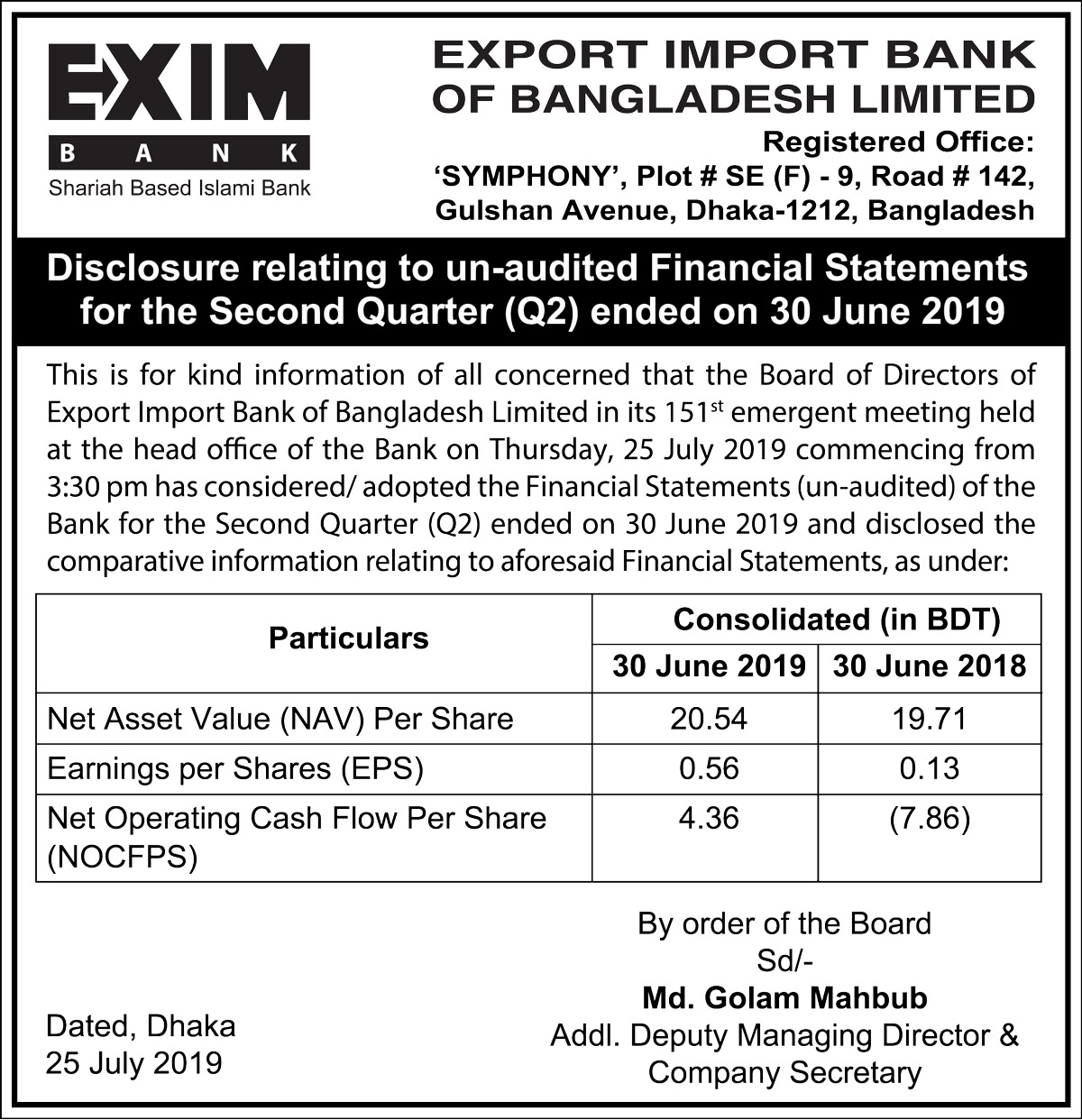 Q2 Financial (Unaudited) Statements of EXIM Bank Limited