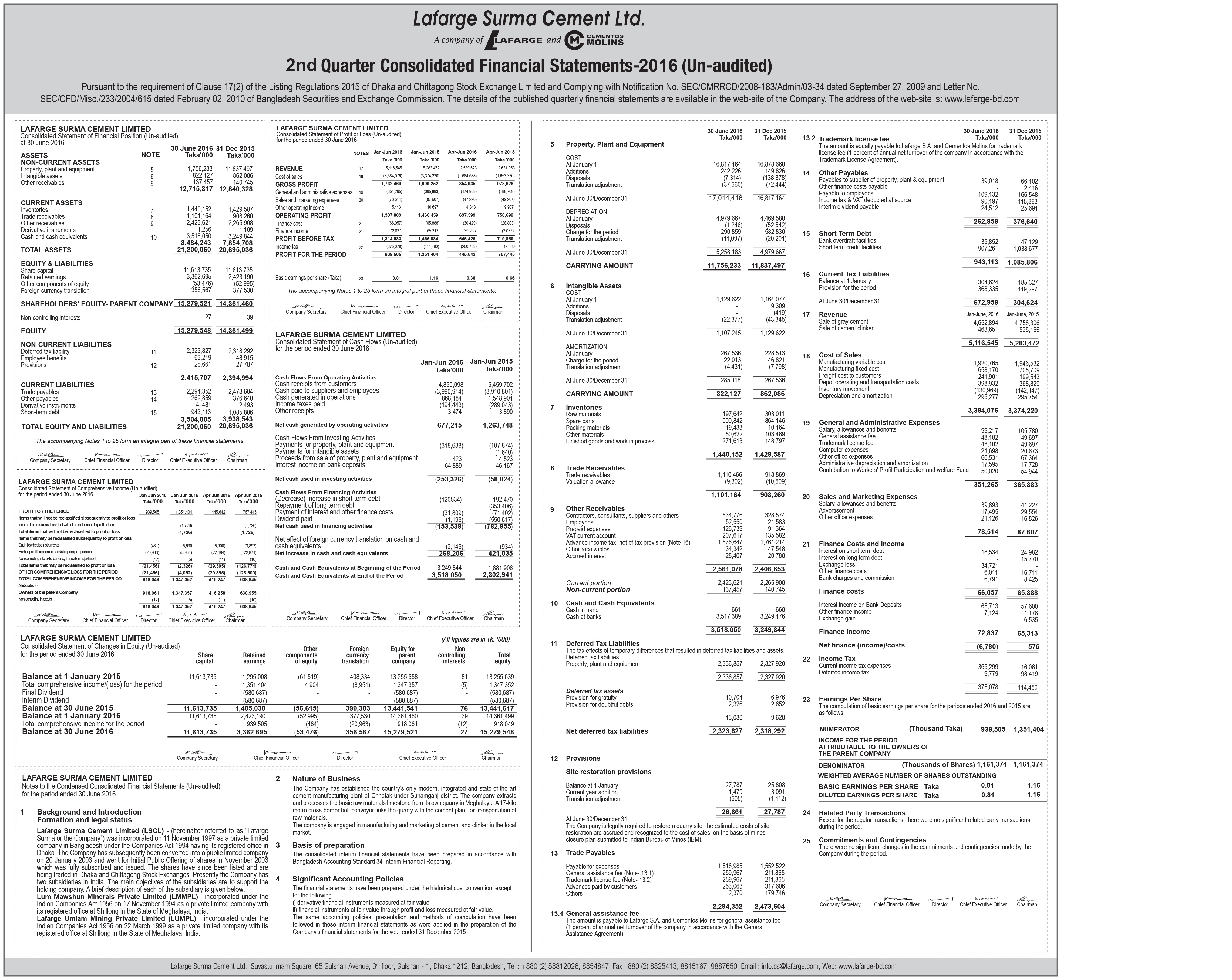 Q2 Financial Statements 2016 of Lafarge Surma Cement Limited