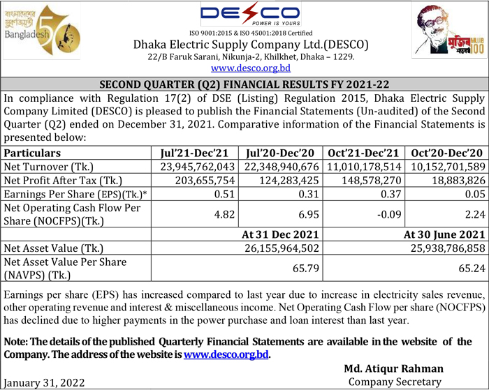 Q2 Financial Statements of Dhaka Electric Supply Company Ltd
