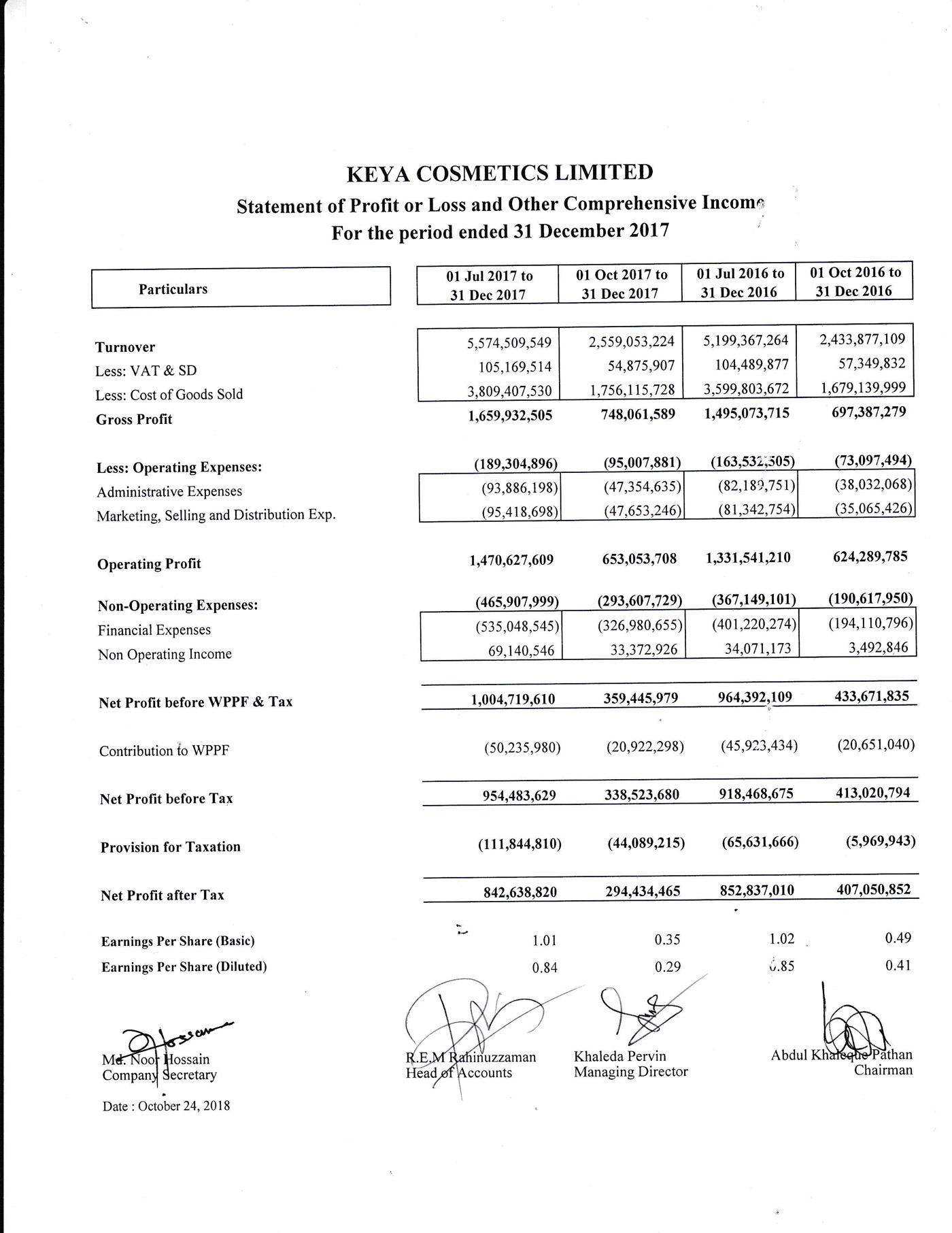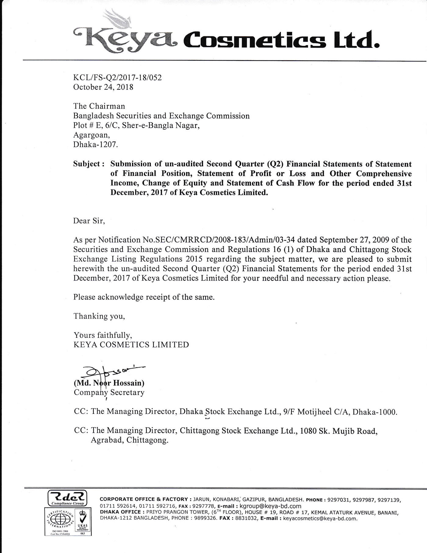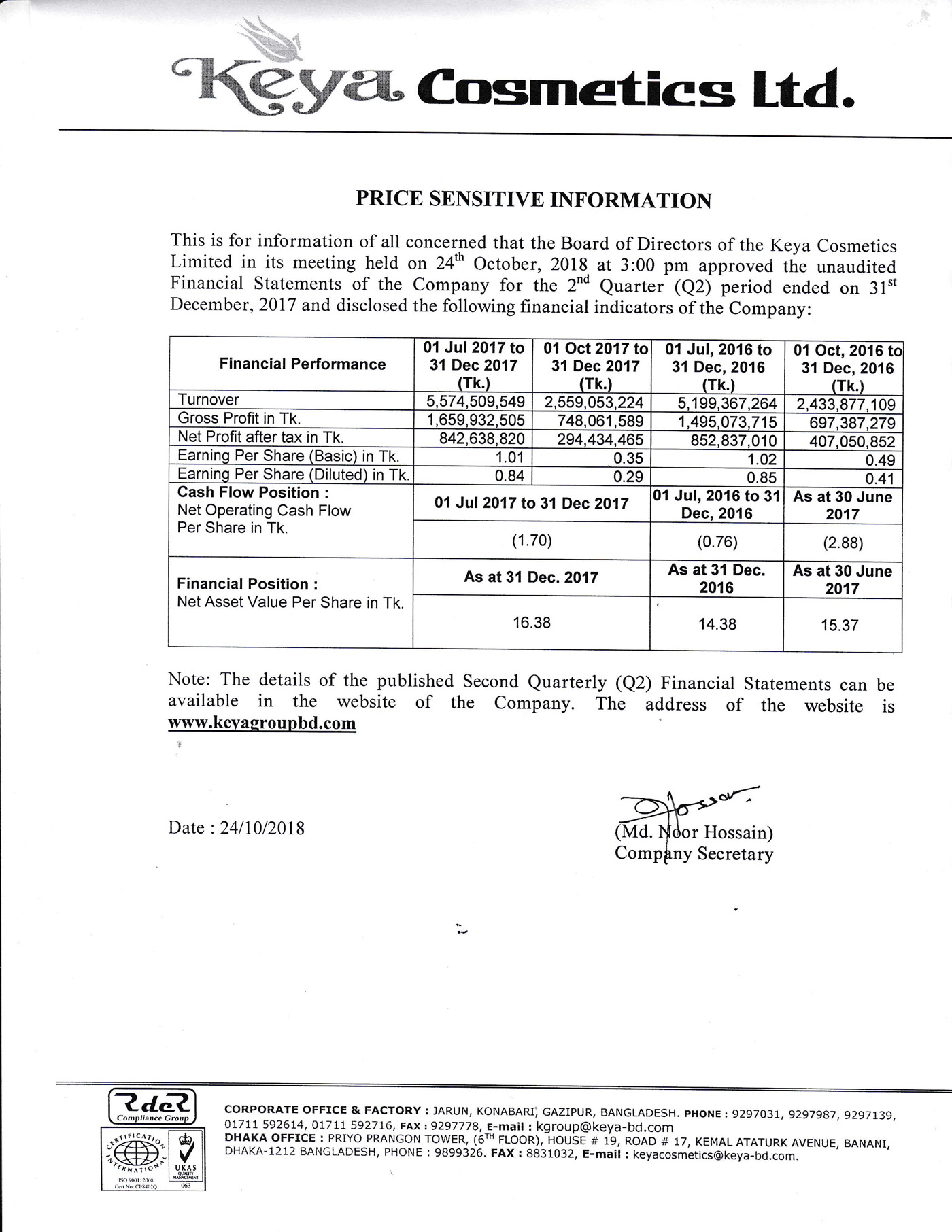 Unaudited Second Quarter Price Sensitive Information of Keya Cosmetics Ltd.