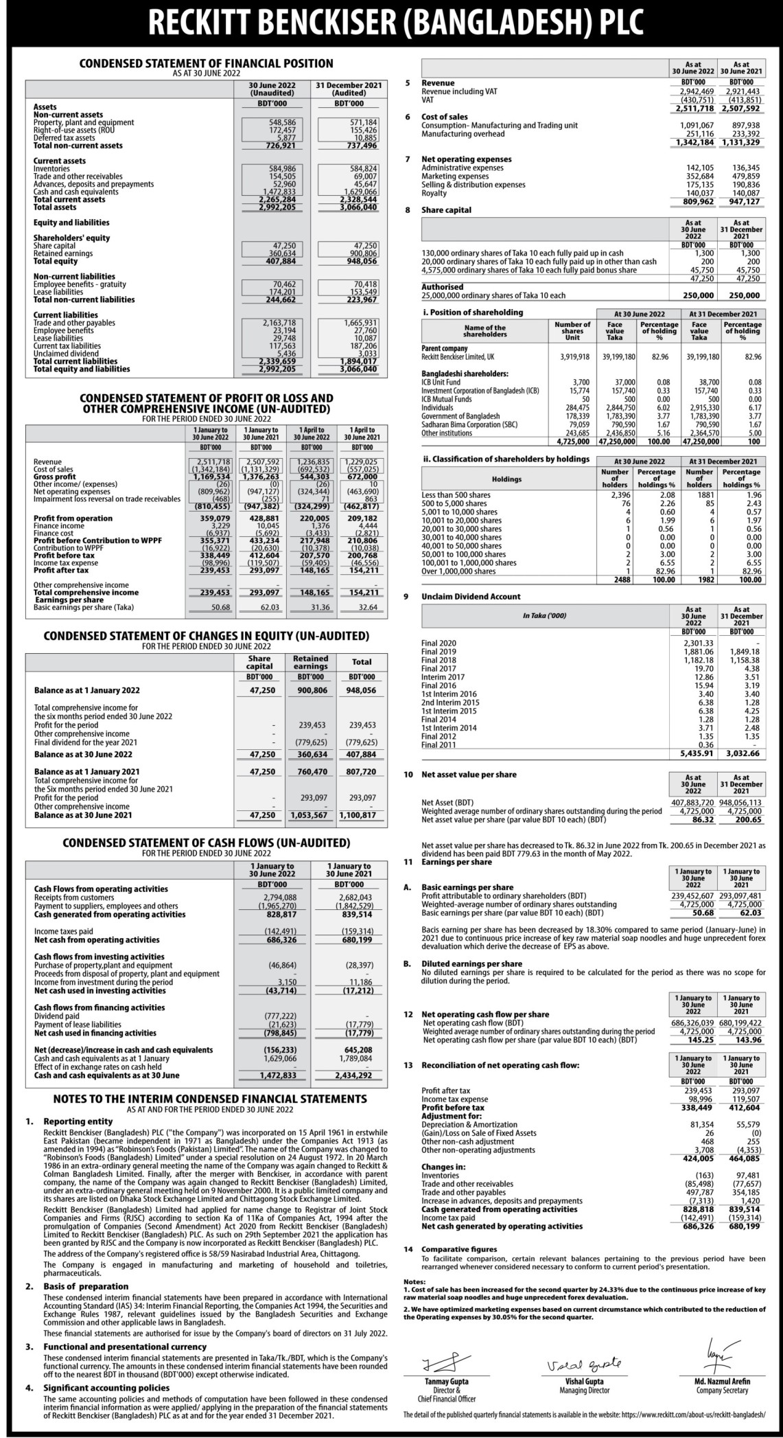 Q2 Financial Statements of Reckitt Benckiser (Bangladesh) PLC