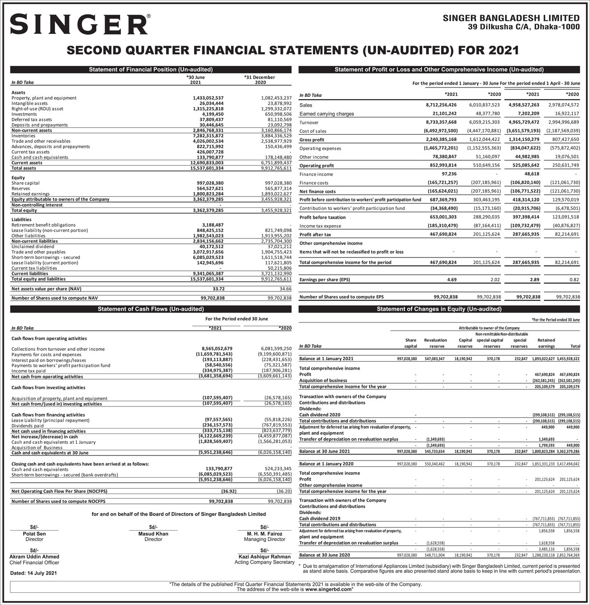 Q2 Financial Statements (Un-audited) for 2021 of Singer Bangladesh Ltd.