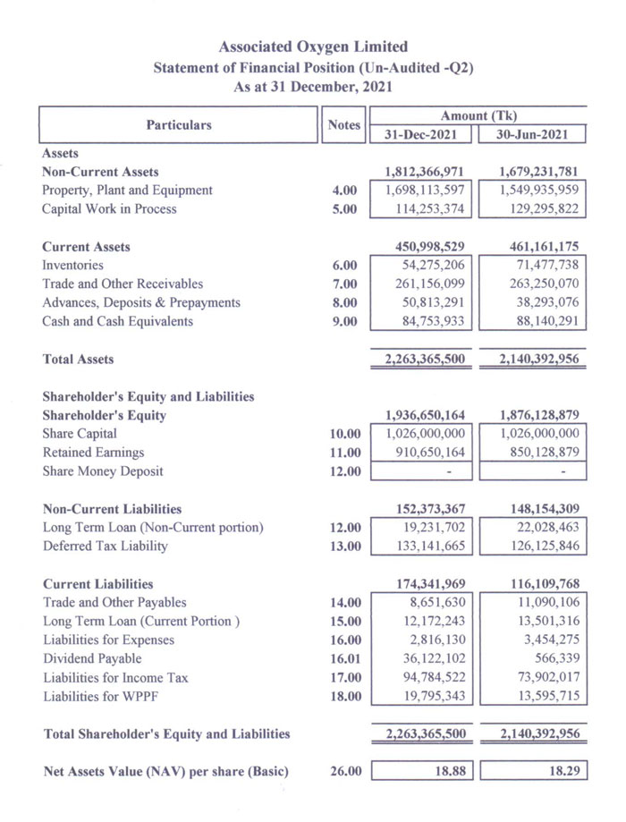 Statements of Financial Position (Un-audited) of Associated Oxygen Limited
