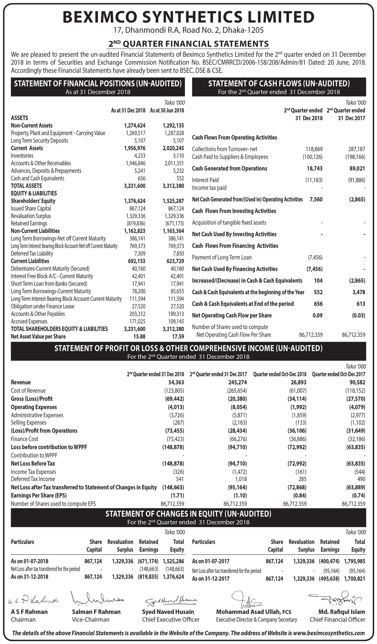 Q2 Financial Statements (Un-audited) of Beximco Synthetics Limited