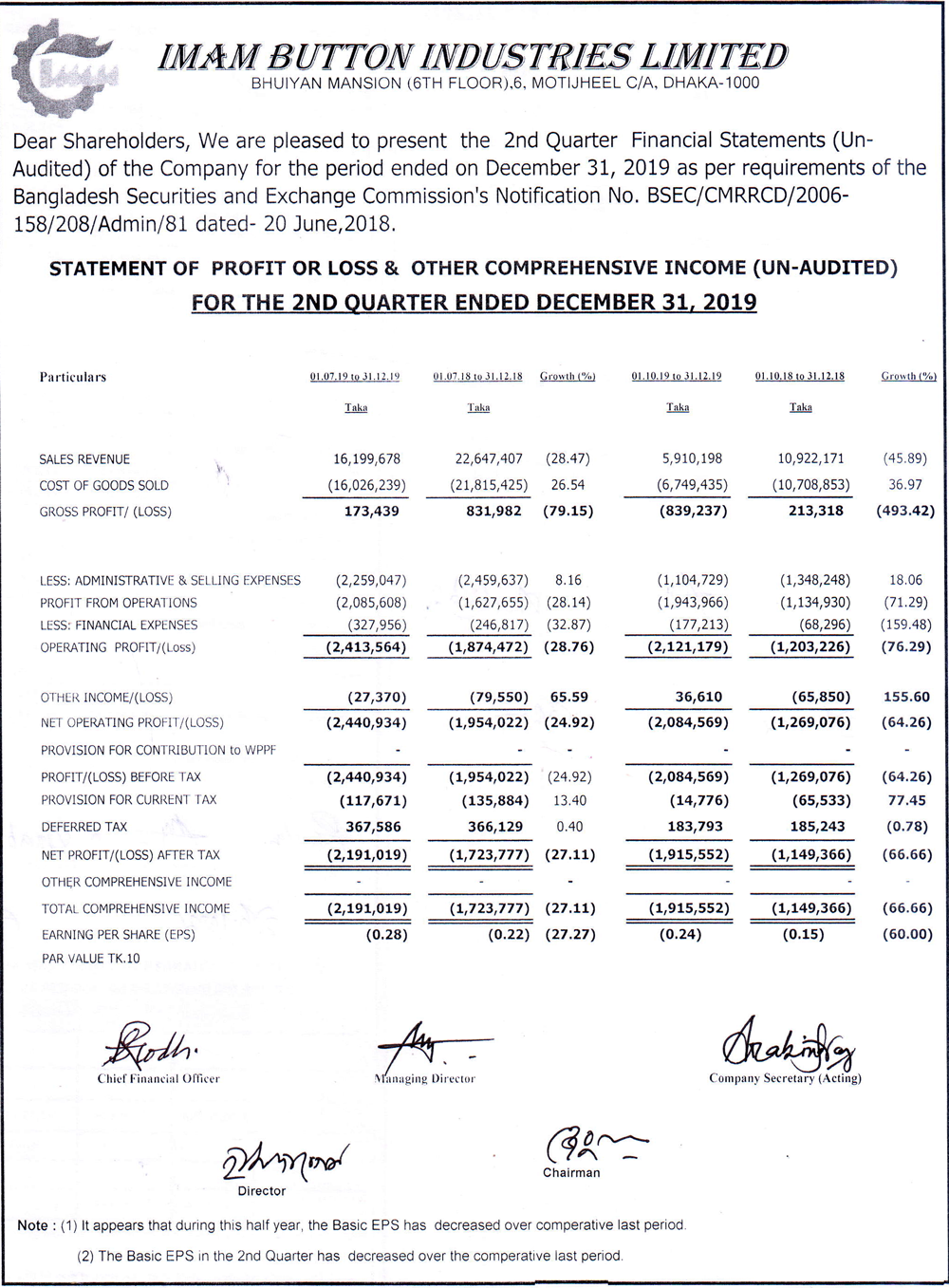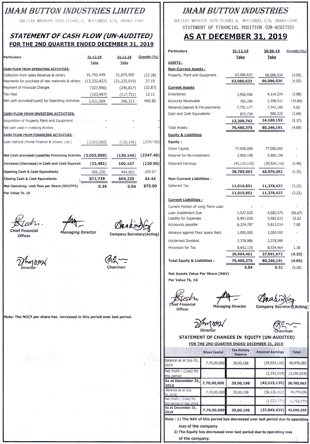 Q2 Financial Statements (Un-audited) of Imam Button Industries Ltd.
