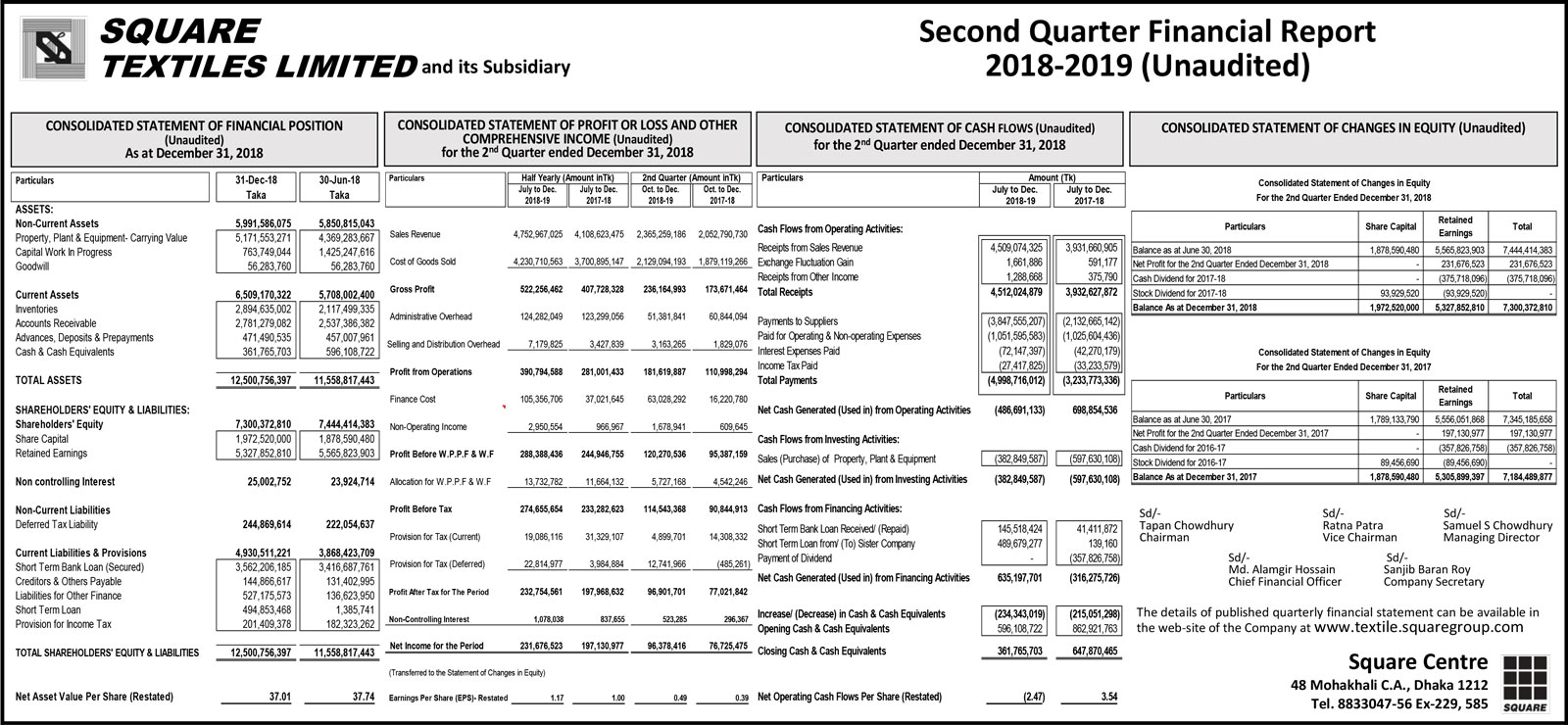 Second Quarter Financial Report Of Square Textiles Limited
