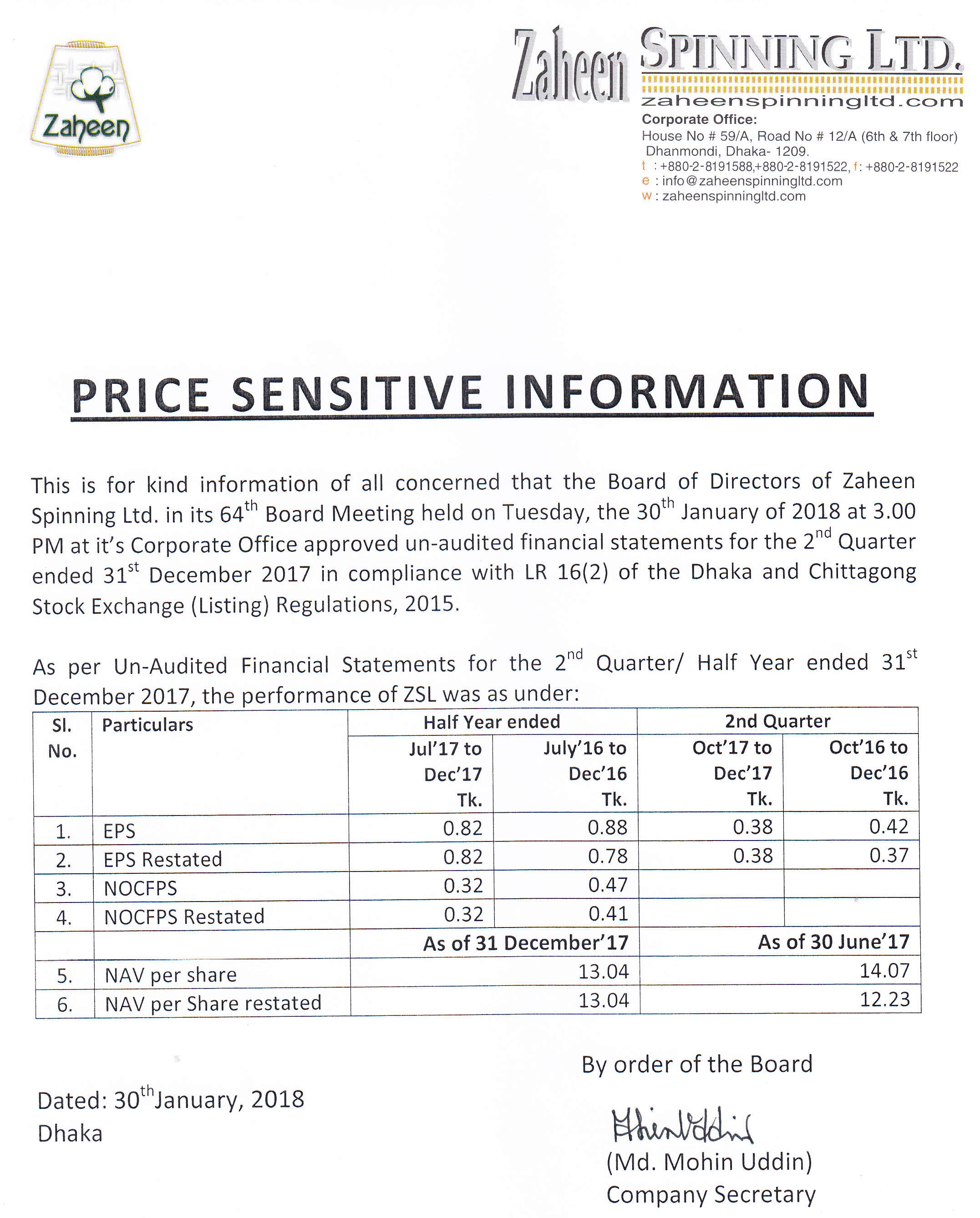 Q2 Financial Statements (Un-audited) of Zaheen Spinning Ltd.