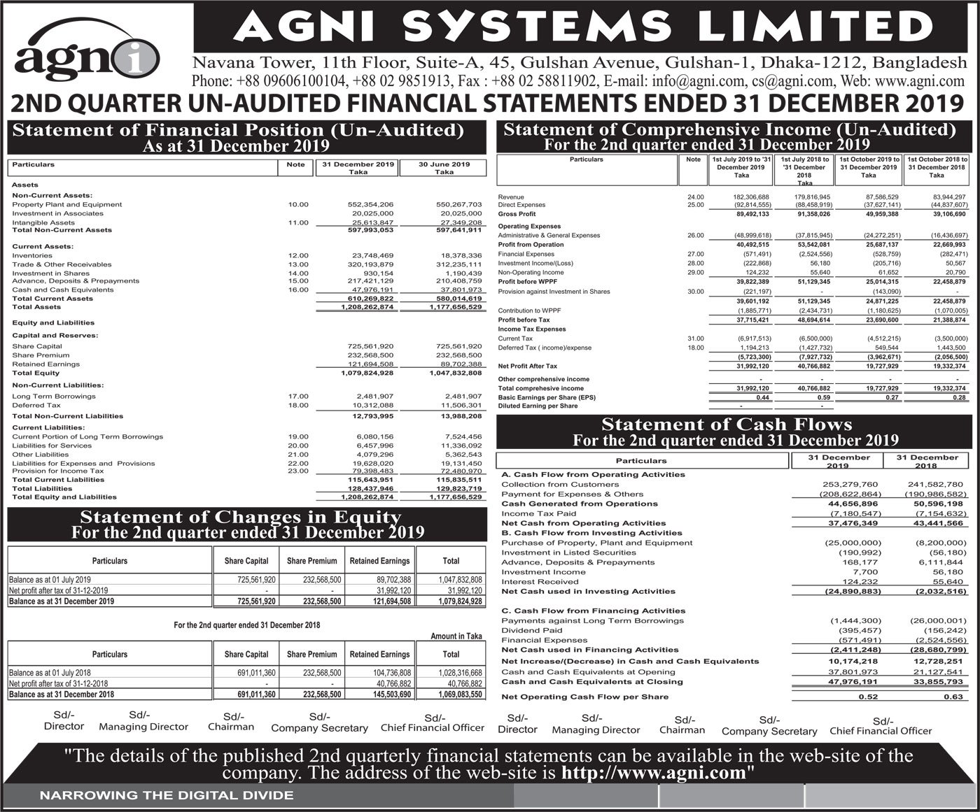 1st Quarter Un-Audited Financial Statements Of Agni Systems Ltd