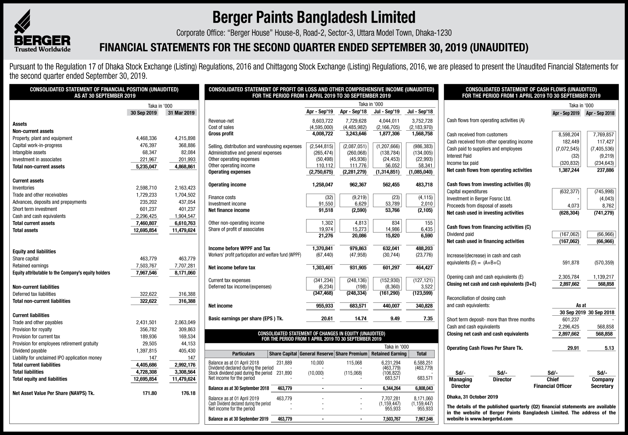 Q2 Un-audited Financial Statements of Berger Paints Bangladesh Ltd