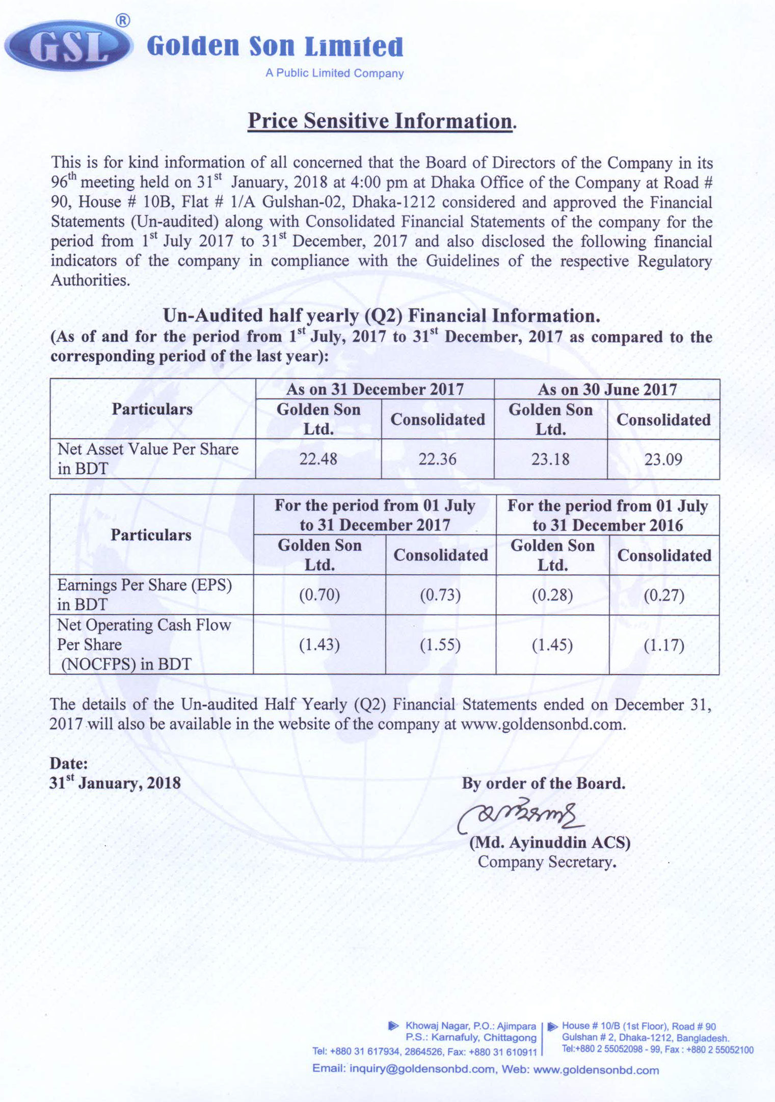 Q2 Un-audited Financial Statements of Golden Son Limited