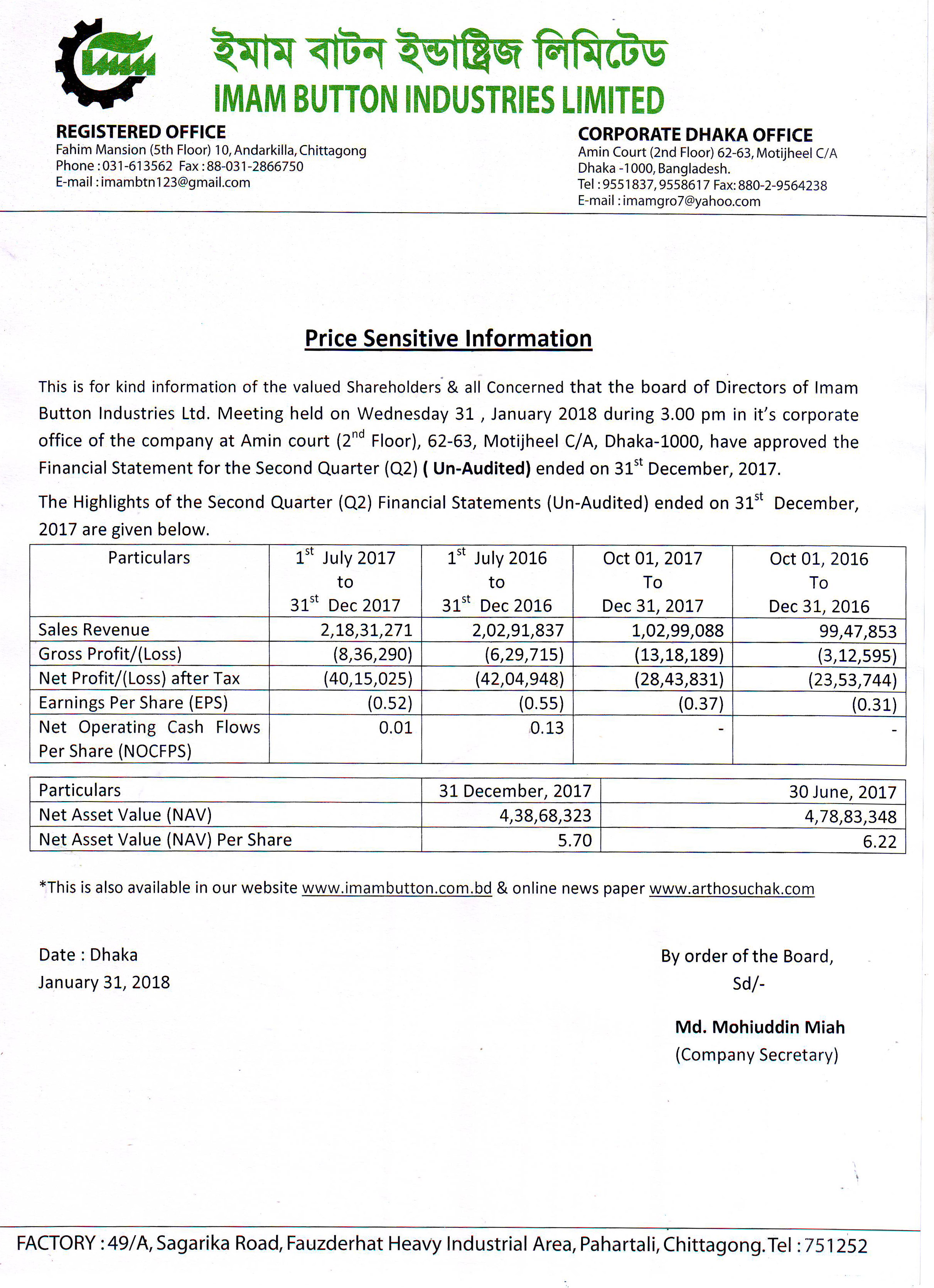 Q2 (Un-audited) Financial Statements of Imam Button Industries Ltd
