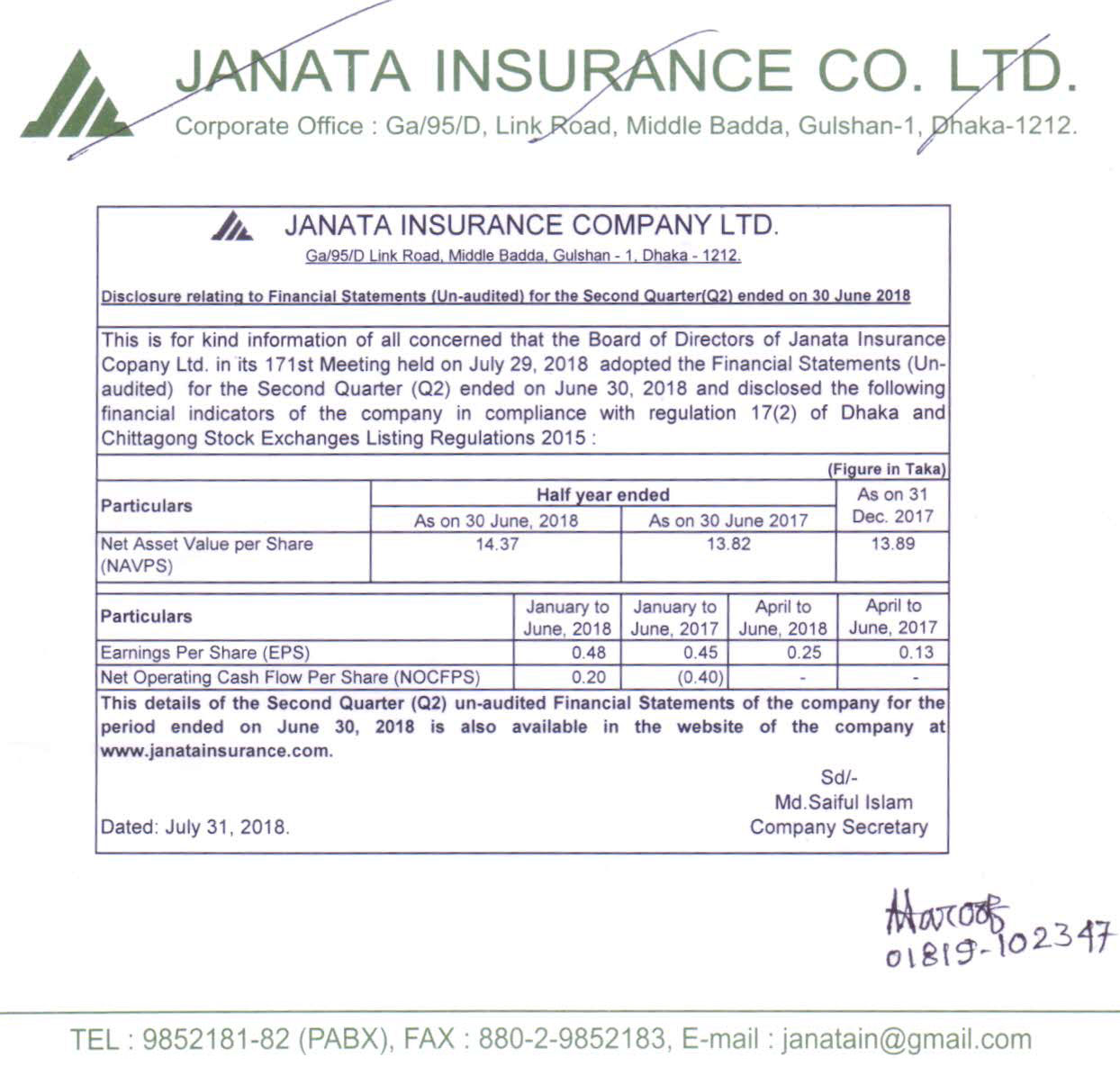 Disclosure Relating to Financial Statements (Un-audited) for the 2Q of Janata Insurance Company Ltd.