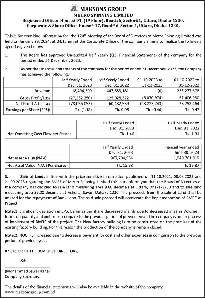 Q2 Un-audited Financial Statements of Metro Spinning Limited