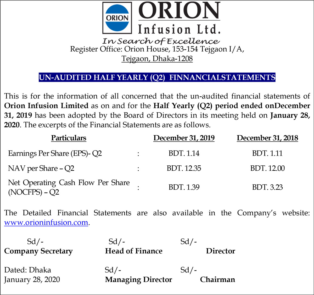 Un-audited Half Yearly (Q2) Financial Statements of Orion Infusion Ltd