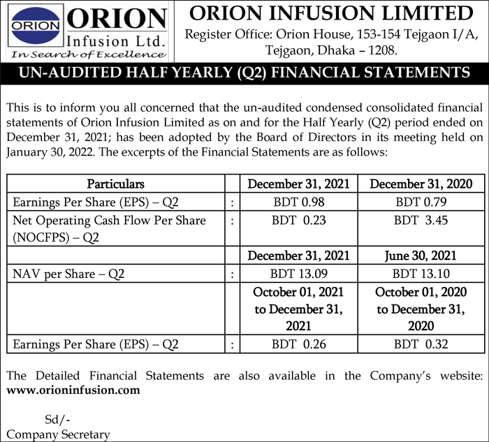 Un-audited Half Yearly (Q2) Financial Statements of Orion Infusion Ltd