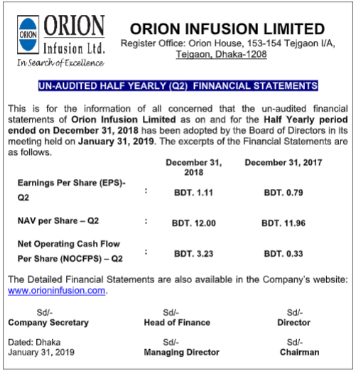 Un-audited Half Yearly (Q2) Financial Statements of Orion Infusion Ltd