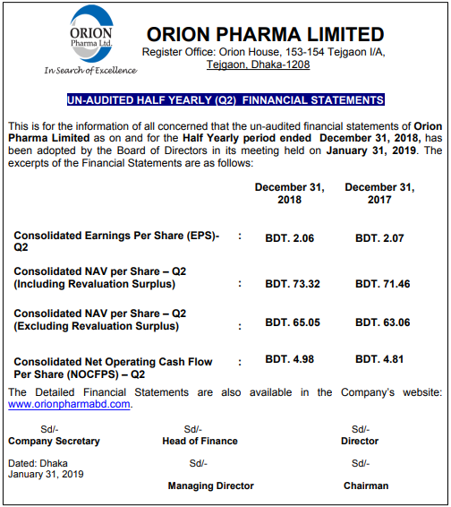 Q2 Un-audited Financial Statements of Orion Pharma Ltd