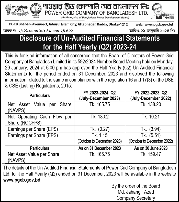 Q2 Un-audited Financial Statements of Power Grid Company of Bangladesh Ltd
