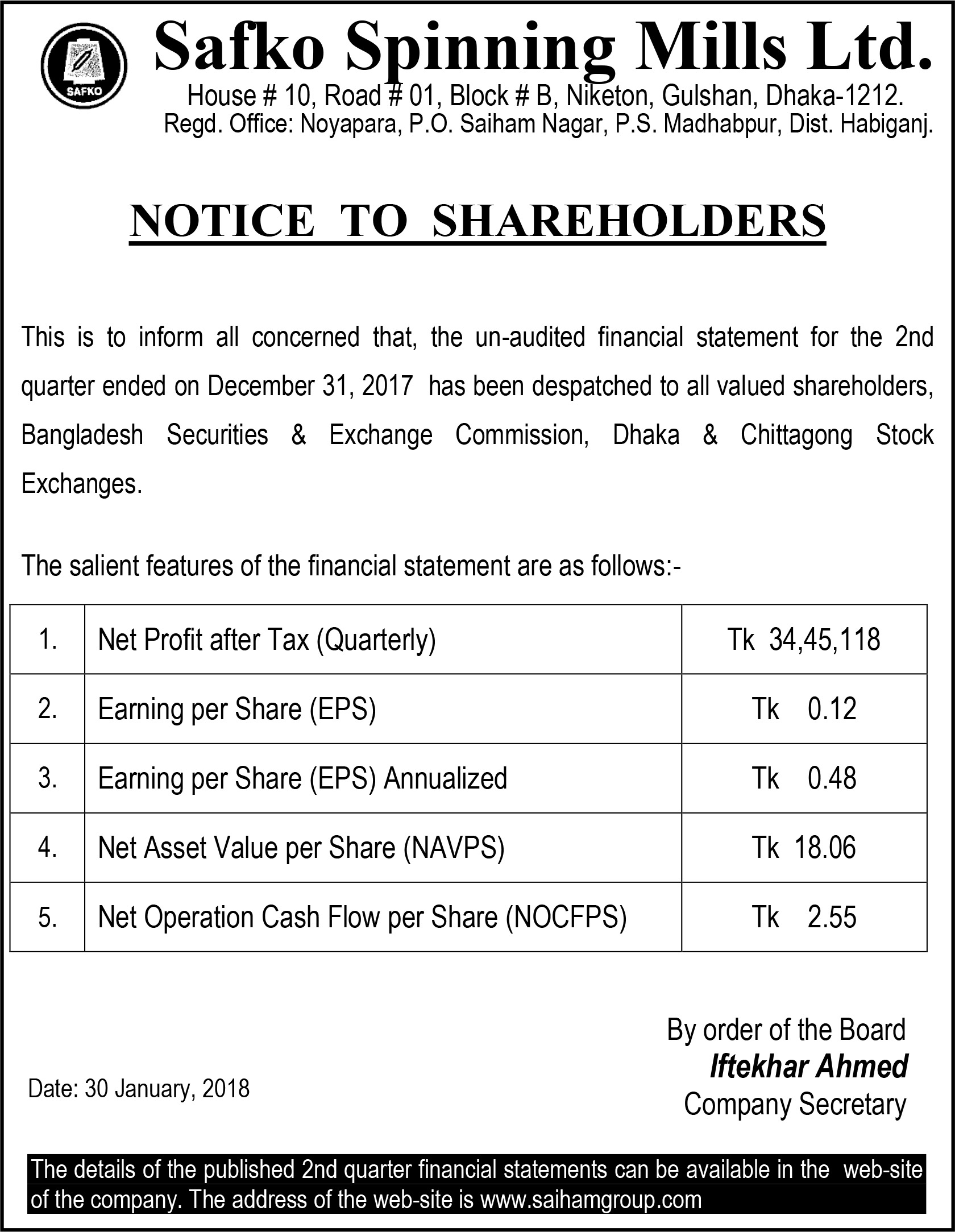 Notice to Shareholders of Safko Spinning Mills Ltd