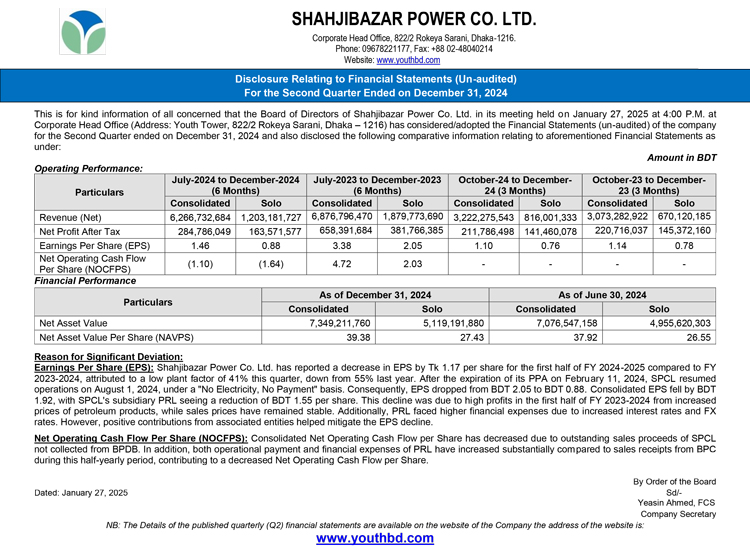 Q2 Un-audited Financial Statements of Shahjibazar Power Co. Ltd