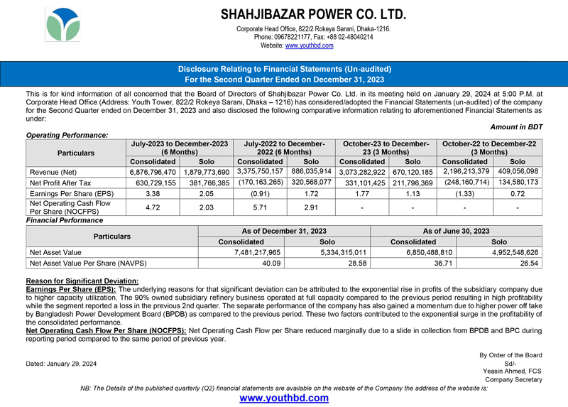 Q2 Un-audited Financial Statements of Shahjibazar Power Co. Ltd