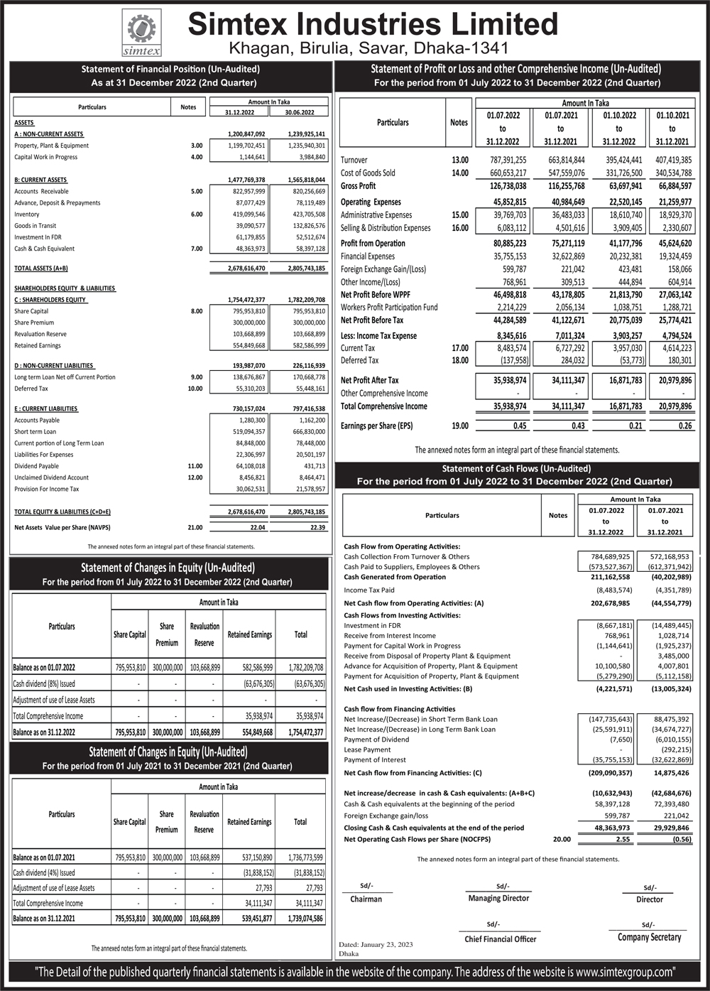 Q2 (Un-audited) Financial Statements of Simtex Industries Limited